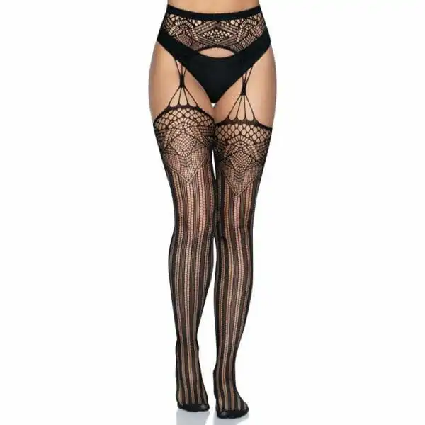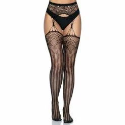 The Layla striped garter belt thigh high stockings by Leg Avenue dare to go where other hosiery couldn’t even imagine. From the stunning deco net detailing and tear-drop garter belt to the striped legs that will have you runway ready, these sexy stockings take your lingerie looks to the next level. Thong panties not included.