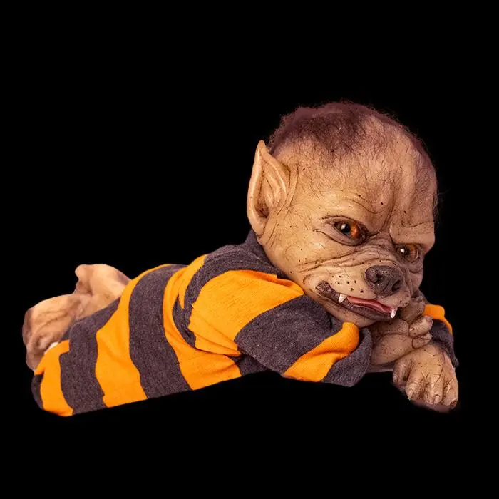 Cooper is the size and weight of a newborn with added spooky charm! He features a solid silicone head, arms, and legs attached to a weighted plush furry body, giving the look and feel of holding a real live baby werewolf!