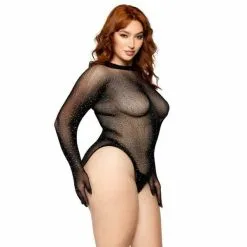 Go full glam in the rhinestone gloved fishnet plus size bodysuit by Leg Avenue. This versatile, must-have sexy plus size lingerie piece takesΒ basic bodysuitsΒ to the next level. Featuring built-in gloves for a dark, sultry vibe and a snap crotch for comfortable wear, this sheer bodysuit is the perfect layering piece for a dramatic night out look or a little roleplay fun in the bedroom.