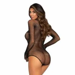 Youâre about to go full glam in the rhinestone gloved fishnet bodysuit by Leg Avenue. This versatile, must-have sexy lingerie piece takes basic bodysuits to the next level. Featuring built-in gloves for a dark, sultry vibe and a snap crotch for comfortable wear, this sheer bodysuit is the perfect layering piece for a dramatic night out look or a little roleplay fun in the bedroom.