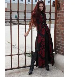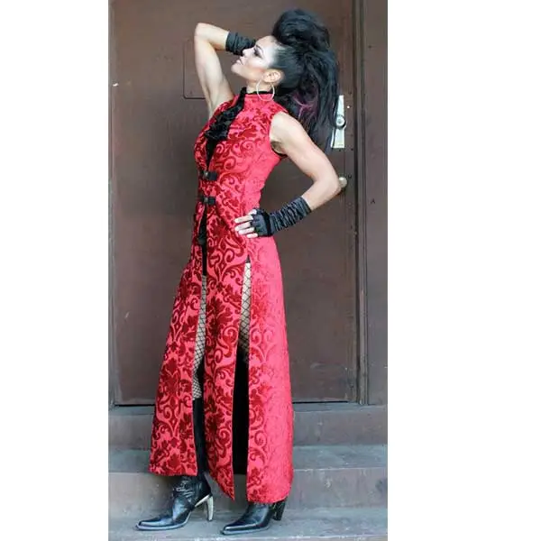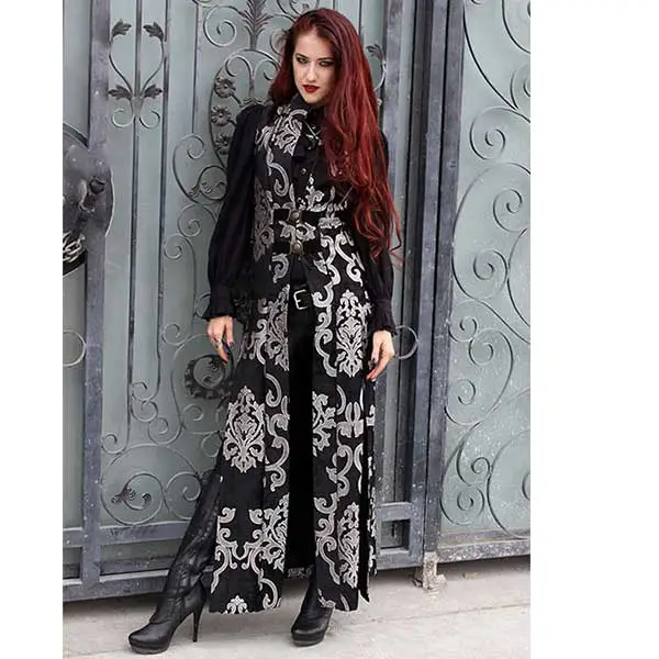 Gorgeous raiment. A dramatic womenโs cassock coat made in lush velvet brocade fabric. Sleeveless with a classic stand-up collar and a slimming fit. Slits in the back sides and front for flowing ease of movement. Fastens in front with two ornate bronze buckles and lined on the inside in sleek satin. Comes in sizes Small-3X!!! โฆ.. T. O. D. I. E. F. O. Rโฆโฆ